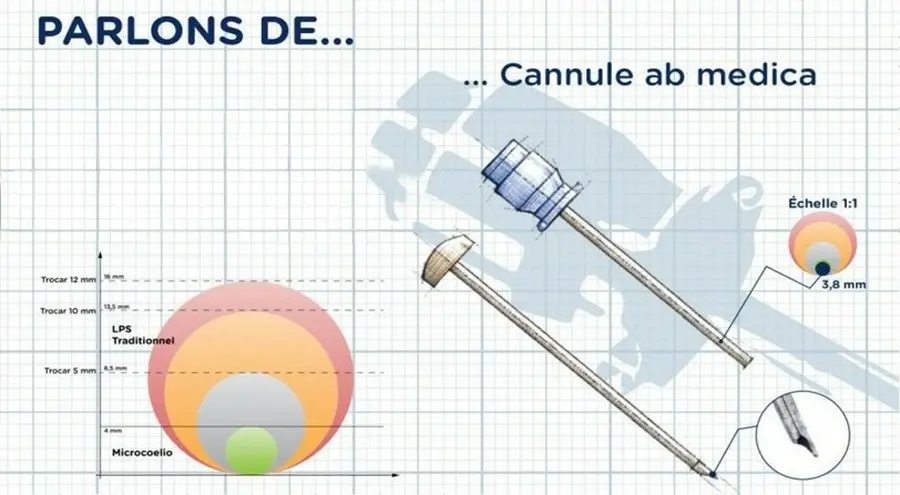 En laparoscopie standard, un trocart de 5 mm nécessite une incision d'environ 8-10 mm et les sutures ultérieures lorsque la chirurgie est terminée . Pour proposer la meilleure alternative chirurgicale minimalement invasive , ab medica microlaparoscopy exploite l'utilisation d'un trocart avec un diamètre externe en dessous de 4 mm.